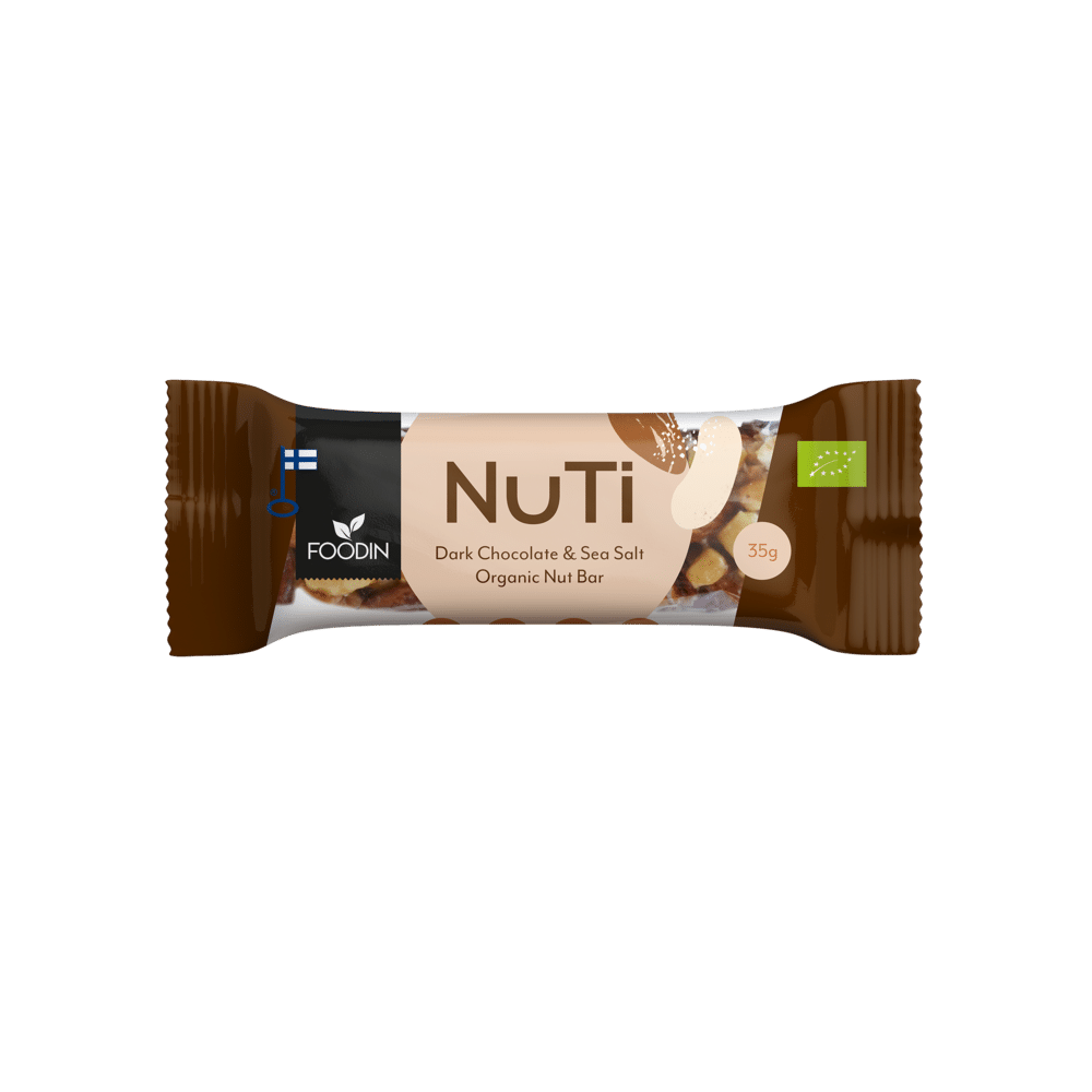 NUTI – økologisk nøttebar Mørk sjokolade og havsalt er en nøtteaktig bar som inneholder rå sjokolade og er toppet med havsalt av høy kvalitet. Denne baren passer for hele familien som snacks! Den svært etterspurte baren på 35 gram er fullpakket med ekte naturens egne ingredienser.