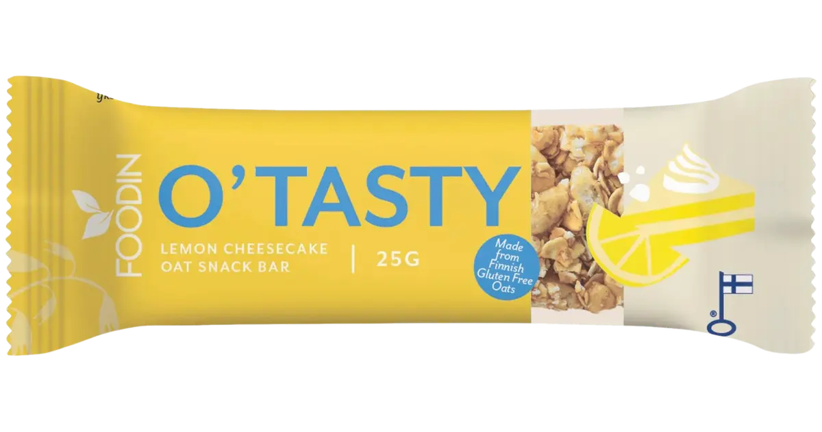 O’tasty Sitronostekakebar, er basert på ren finsk havre. Havrebaren inneholder ikke hvitt sukker, nøtter, melk eller palmeolje, men har en deilig smak og herlig tekstur. Den deilige havrebaren med sitronostekake-smak kombinerer syrlig sitron og sukkerfri hvit sjokolade som smelter i munnen.