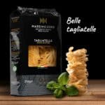 Den er formet som lange, smale pastaplater (ca. 0.5 cm brede), ikke ulik fettuccine. laget i nøster. Disse brukes mye om hverandre, og kalles ofte «båndspaghetti» på norsk.