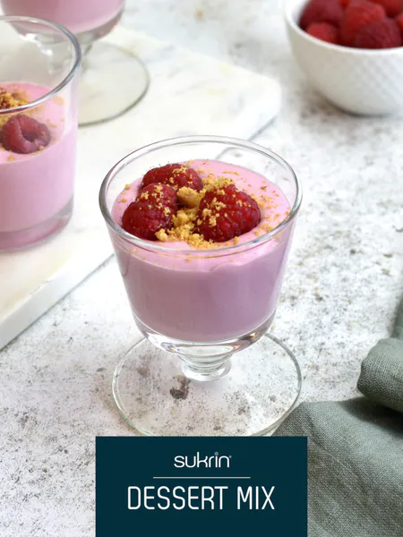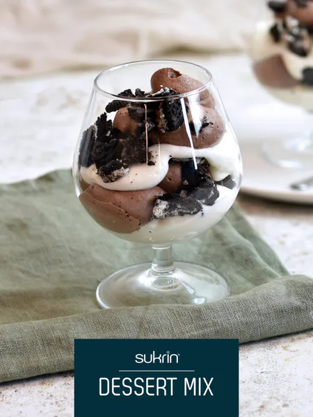 Sukrin Dessert mix er en nøytral dessertmiks som skal blandes med kremost og væske. Miksen er uten tilsatt sukker og naturlig søtet med Sukrin og stevia. Den gir store variasjonsmuligheter, da du kan bruke den smakstilsetningen og serveringsmåten du ønsker. Miksen er perfekt som base i en lett ostekake, eller den kan brukes som en bærmousse ved å tilsette bærsaft. Eller hva med å legge den lagvis med Sukrin Chocolate mousse i et pent glass og pynte med litt knust kjeks eller bær?