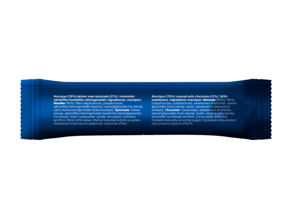 Marsipan: Mandler (45%), fiber (oligofruktose, polydextrose), søtstoffer (erytritol, steviolglykosider fra stevia), vann, konserveringsmiddel (kaliumsorbat).